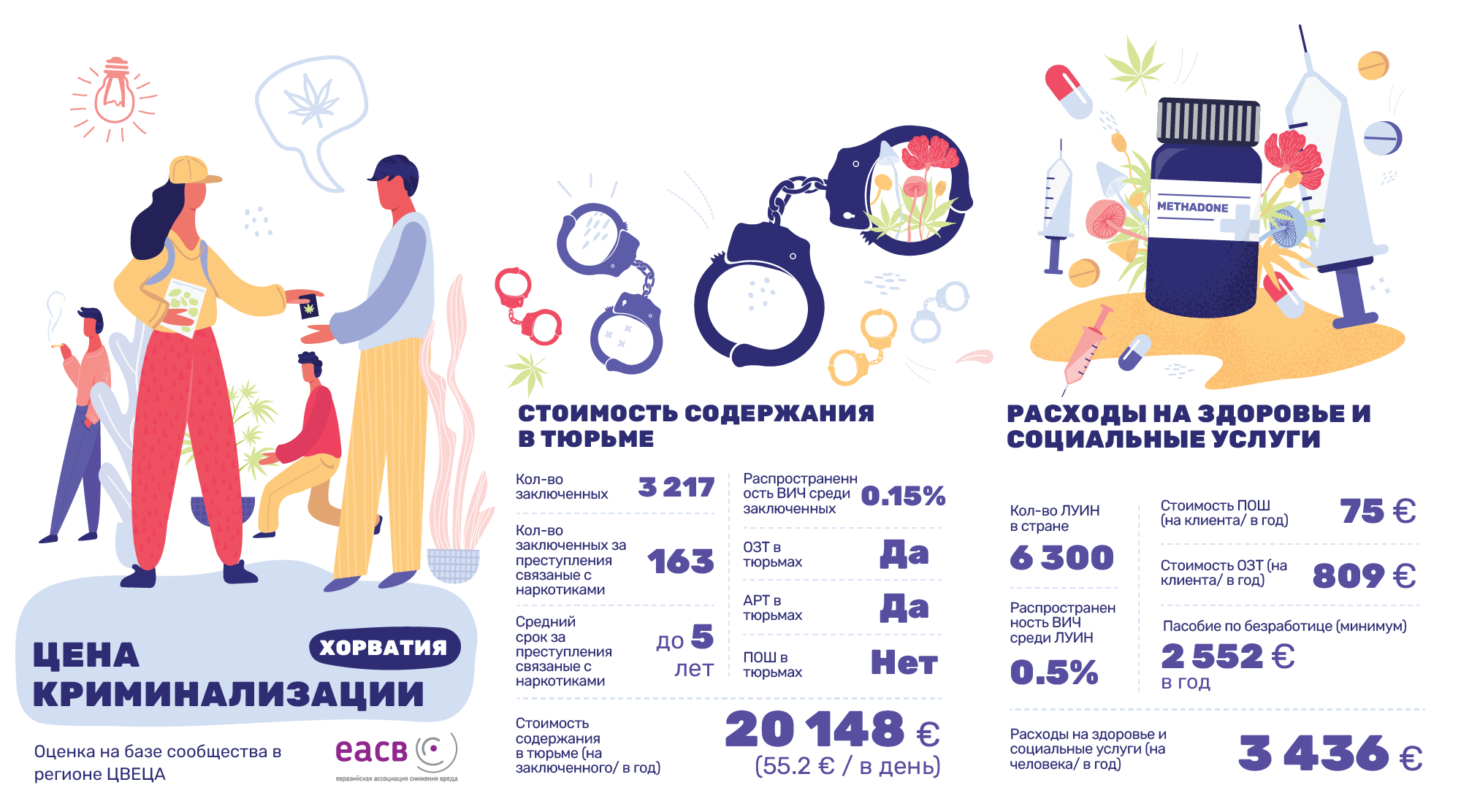 По оценкам 2020 года в Хорватии насчитывалось 6300 человек, употребляющих инъекционные наркотики, а показатель распространенности ВИЧ составлял 0,5% [7]. Затраты на ПОИШ в 2018 году составили 75 евро на клиента в год, а стоимость ОЗТ – 809 евро на клиента в год [8]. Пособие по безработице предоставляется из расчета 2551,80 евро на человека в год в течение первых 90 дней, после чего размер пособия снижается до 60% [9].