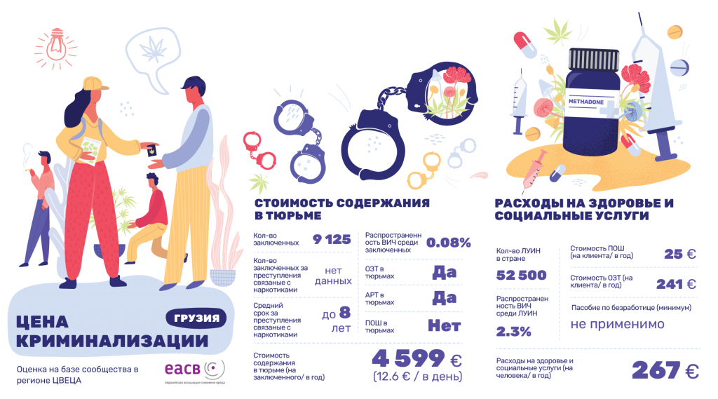 Из-за отсутствия официального пособия по безработице, расходы правительства Грузии на оказание помощи человеку, употребляющему опиоидные наркотики, в условиях сообществ составляют всего 267 евро в год. Это значительно меньше, чем затраты государства на заключение такого человека в тюрьму, что могло бы позволить государству сэкономить 4332 евро на одного употребляющего наркотики в год. Таким образом, правительство Грузии могло бы экономить до 11,5 миллионов евро в год за счет декриминализации употребления и хранения наркотиков.