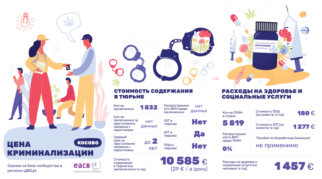 Таким образом, оказание помощи человеку, употребляющему инъекционные опиоиды, в условиях сообществ обойдется правительству Косово в 1457 евро в год, тогда как заключение такого человека в тюрьму за употребление и хранение наркотиков будет стоить государству 10585 евро в год. Следовательно, отменив уголовную ответственность за употребление и хранение наркотиков, правительство Косово могло бы экономить по 9128 евро на заключенного в год.